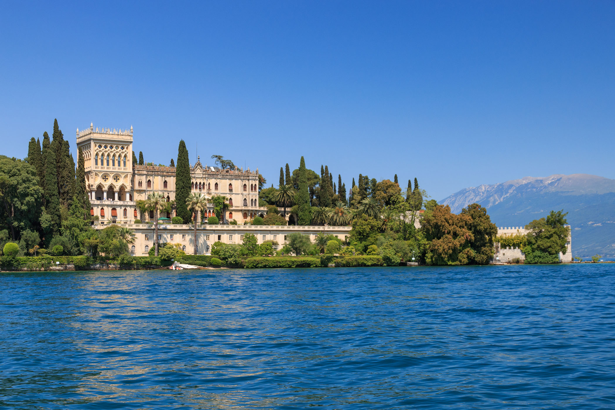 Vi starter denne rundtur ude på selve Gardasøen, og vi kan lige så godt sige det med det samme – det bliver ikke meget mere idyllisk, eksklusivt og umiskendeligt italiensk end her på Isola del Garda. Den lille ø ligger en kort sejltur fra havnen i Saló, og selvom den er ejet af den stenrige Cavazza-familie, så har den de sidste 25 år været åben for offentligheden, der kan beundre den dominerende, gotiske pragtvilla, de nysseligt anlagte haver og de karakteristiske cypresser, der står over alt på den under én km2 lille ø.