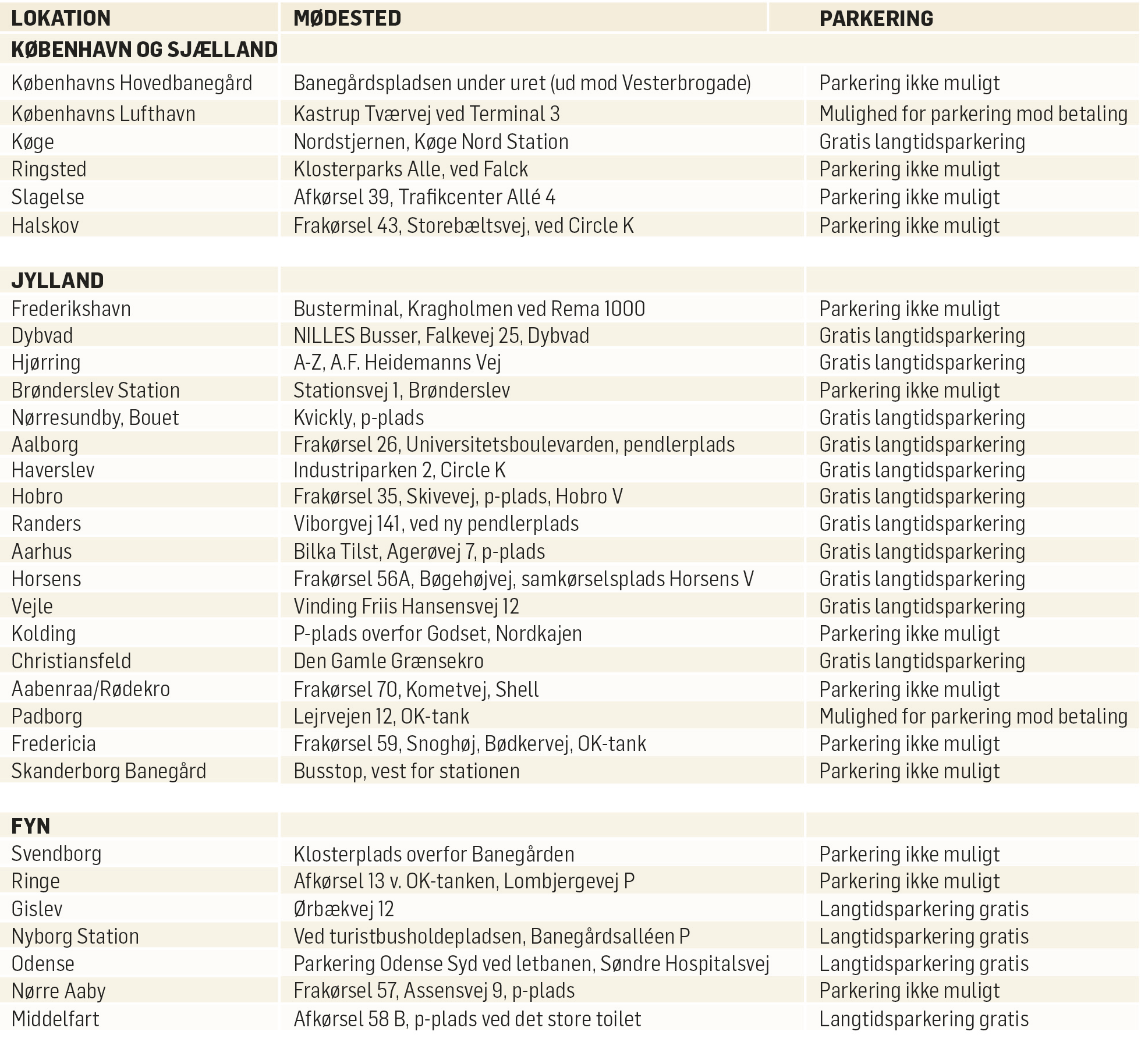 Se den komplette liste over opsamlingssteder nedenfor. Og se den specifikke opsamlingsrute for din valgte busrejse, når du bestiller den på nettet eller taler i telefon med en af vores sælgere.