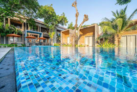 Her finder du en indbydende swimmingpool i skyggen af palmerne – og kun få skridt væk ligger stranden med lyst sand og klart vand. Langs vandkanten ligger små restauranter og spisesteder, hvor du kan nyde aftenerne med fødderne i sandet og havet som kulisse.
